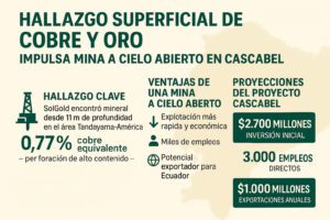 El reciente descubrimiento de cobre y oro a escasa profundidad en el proyecto Cascabel, ubicado en la provincia de Imbabura, podría marcar un antes y un después para la minería en Ecuador. La empresa SolGold confirmó, el 10 de noviembre de 2025, que en el área Tandayama-América (TAM), una perforación reveló mineralización desde apenas 11 metros de profundidad, con un contenido promedio de 0,77 % de cobre equivalente.