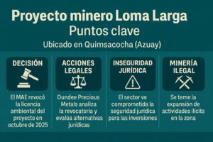 La revocatoria de la licencia al proyecto minero Loma Larga podría marcar un antes y un después para el desarrollo de la minería formal en Ecuador. Si la decisión se ratifica, podría afectar la llegada de nuevas inversiones y generar mayor inestabilidad.